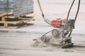 Pracownicy mielą betonową podłogę na placu budowy. Przygotowuje podłogę do zaprawy poliuretanowej
