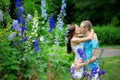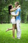 Szczęśliwa młoda para dorosłych w miłości na polu. dwa, człowiek i wom