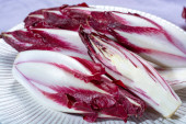 Zdrowe jedzenie, świeże belgijskie endive czerwona cykoria sałata lof zbliżenie