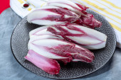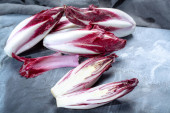Zdrowe jedzenie, świeże belgijskie endive czerwona cykoria sałata lof zbliżenie