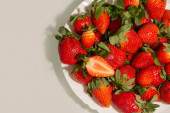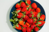 Zdjęcie "Czerwone pyszne truskawki z liśćmi w białej ceramicznej płytce na szklanym stole. Przestrzeń kopiowania" może być wykorzystywane do celów osobistych i komercyjnych zgodnie z warunkami zakupionej licencji Royalty-free. Obraz jest dostępny do pobrania w jakości wysokiej rozdzielczości do 5760x3840.