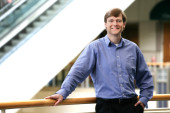 Biały mężczyzna po czterdziestce w niebieskiej koszuli w pociągu dojeżdżającym do pracy, uśmiechnięty i siedzący przed kamerą