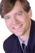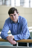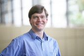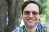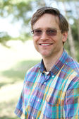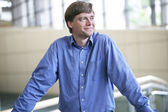 Biały mężczyzna po czterdziestce w niebieskiej koszuli w pociągu dojeżdżającym do pracy, uśmiechnięty i siedzący przed kamerą