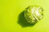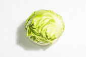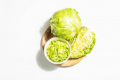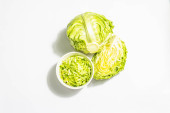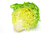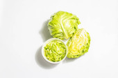 Świeża młoda kapusta, pół głowy odizolowane w białym tle. Nowoczesne twarde światło, ciemny cień.Warzywa do cięcia sałatki wiosennej. Wegańskie jedzenie, dieta, witaminy