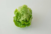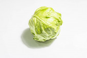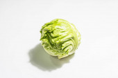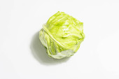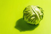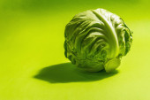 Świeża młoda kapusta, cała głowa odizolowana w białym tle. Nowoczesne twarde światło, ciemny cień.Warzywa do cięcia sałatki wiosennej. Wegańskie jedzenie, dieta, witaminy