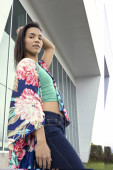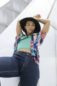 młoda kobieta z krótkimi włosami siedzi z twarzą w profilu myśląc o spokojnym dniu w mieście, stylu życia w tle roślin