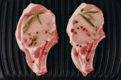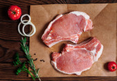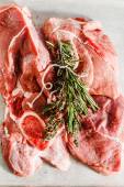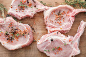 Surowe mięso wieprzowe z tymiankiem i przyprawami na rustykalnym tle. Wybiórcze skupienie. Płytka głębia ostrości.
