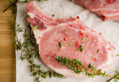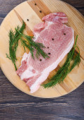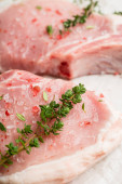 Surowe mięso wieprzowe z tymiankiem i przyprawami na rustykalnym tle. Wybiórcze skupienie. Płytka głębia ostrości.
