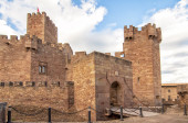 CARCASSONE, FRANCJA - GRUDZIEŃ 28, 2019: Widok na nadmorskie wejście z wieżą z zabytkowego zamku carcassone-cite de carcassone