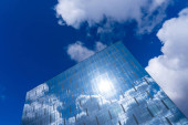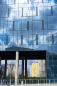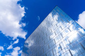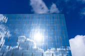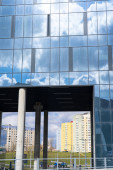 Zamazane tło fasady z wielokrotnymi odbiciami zachmurzonego nieba i słońca. Wygląd nowoczesnego budynku. Architektura abstrakcyjne tło