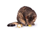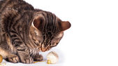Naughty Maine Coon kot kradzież zabawki myszy krawędzi, odnosząc się do holenderskiego nawyku: beschuit spotkał muisjes. Izolacja na białym tle z przestrzenią do kopiowania.
