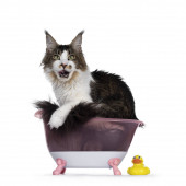 Zdjęcie "Naughty Maine Coon kot kradzież zabawki myszy krawędzi, odnosząc się do holenderskiego nawyku: beschuit spotkał muisjes. Izolacja na białym tle z przestrzenią do kopiowania." może być wykorzystywane do celów osobistych i komercyjnych zgodnie z warunkami zakupionej licencji Royalty-free. Obraz jest dostępny do pobrania w jakości wysokiej rozdzielczości do 5760x3840.