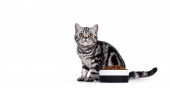 Maine Coon kot siedzi między płytą suger powlekane typowy holenderski leczyć na stare lata przeddzień: oliebollen. Izolacja na białym tle.