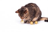 Maine Coon kot siedzi obok płyty suger powlekane typowy holenderski leczyć na stare lata przeddzień: oliebollen. Izolacja na białym tle.
