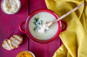 Francuska zupa cebulowa z tostami i serem. Kuchnia francuska. Żywność wegetariańska