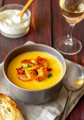 Francuska zupa cebulowa z tostami i serem. Kuchnia francuska. Żywność wegetariańska