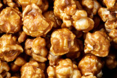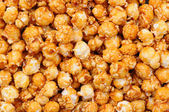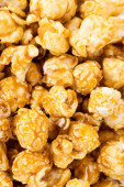 karmelowe popcorn tło. Złoty karmelowy popcorn z bliska. Tło popcornu. Przekąski i jedzenie na film