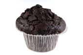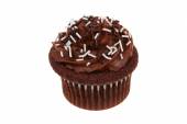 Smaczne czekoladowe babeczki na białym tle. Czekoladowa babeczka karmelowa i syrop karmelowy. Babeczka czekoladowa izolowana na białym.