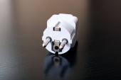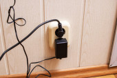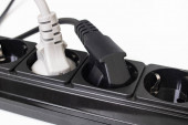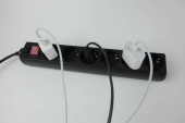 Czarny przedłużacz z przyciskiem i przewodami na białym tle zbliżenie
