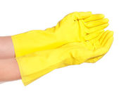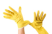 żółta rękawica do czyszczenia izolowana na białym tle. Detergenty do domu. Środki czyszczące.