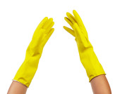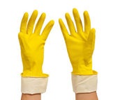 żółta rękawica do czyszczenia izolowana na białym tle. Detergenty do domu. Środki czyszczące.
