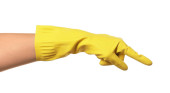 żółta rękawica do czyszczenia izolowana na białym tle. Detergenty do domu. Środki czyszczące.