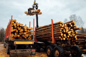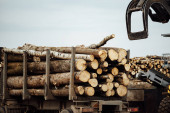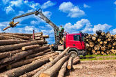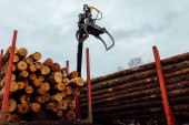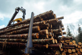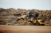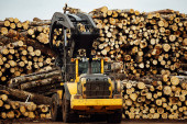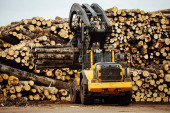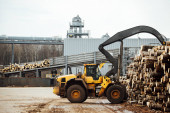 ładowarka czołowa do załadunku drewna. ciągnik przemysłowy transportuje ścięte drewno. zakład przetwórstwa drewna. załadunek drewna do magazynu