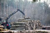 ładowarka czołowa do załadunku drewna. ciągnik przemysłowy transportuje ścięte drewno. zakład przetwórstwa drewna. załadunek drewna do magazynu