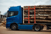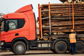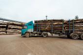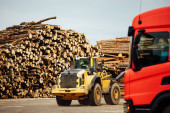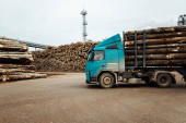 ciężarówka rozładowuje tony odpadów drzewnych. trociny i wióry są przechowywane do dalszego przetwarzania. góry z drewna odpadowego