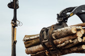 ładowarka czołowa przewozi pozyskane drewno do fabryki. transport przemys? owy w magazynie. załadunek surowców drzewnych na przenośnik taśmowy w fabryce