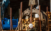 ładowarka czołowa przewozi pozyskane drewno do fabryki. transport przemys? owy w magazynie. załadunek surowców drzewnych na przenośnik taśmowy w fabryce