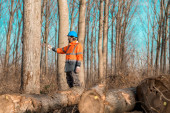 Zdjęcie "pracownik w kombinezonie stoi plecami do magazynu drewna. dużo kłód zebranych do obróbki drewna w fabryce. Człowiek w fabryce w Rob" może być wykorzystywane do celów osobistych i komercyjnych zgodnie z warunkami zakupionej licencji Royalty-free. Obraz jest dostępny do pobrania w jakości wysokiej rozdzielczości do 5760x3840.