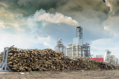 magazyn ściętych drzew w fabryce. Kominy w fabryce palenia zanieczyszczają atmosferę. przedsiębiorstwo zajmujące się obróbką drewna niszczy lasy i szkodzi środowisku. surowce drzewne