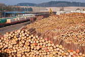 magazyn ściętych drzew w fabryce. Kominy w fabryce palenia zanieczyszczają atmosferę. dźwig przemysłowy rozładowuje surowce drzewne