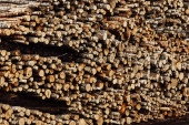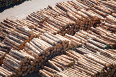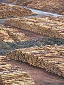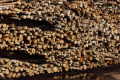 magazyn ściętych drzew w fabryce. Kominy w fabryce palenia zanieczyszczają atmosferę. dźwig przemysłowy rozładowuje surowce drzewne