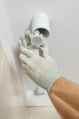 Ręka budowlańca pakiety pracownicze sufit z tynkiem szpachlowym wyrównanie sufitu z łopatką. Roboty remontowo-budowlane