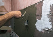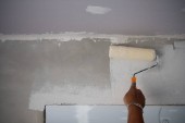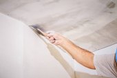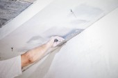Ręka budowlańca pakiety pracownicze sufit z tynkiem szpachlowym wyrównanie sufitu z łopatką. Roboty remontowo-budowlane