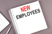 Koncepcja biznesu. Zeszyt z tekstem NOWE ZATRUDNIENIA arkusz białego papieru do notatek, laptop, okulary, ołówek, długopis, na tle wykresu