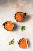 Trzy miski zupy pomidorowej lub gazpacho z mielonym pieprzem, rozmarynem i paluszkami chlebowymi. Widok góry. Odbiór. Skupienie selektywne.