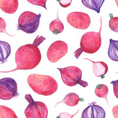 Radykalny róż i krojona rzodkiewka na białym tle. Płynny wzór akwareli. Wegańskie druki dla kuchni i kawiarni.