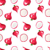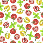 Płynny wzór akwareli. Sos pomidorowy, pomidory, zioła i szpinak. Wegańskie druk dla kuchni i kawiarni. Warzywa ekologiczne na białym tle.