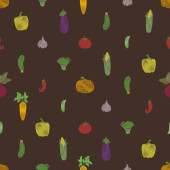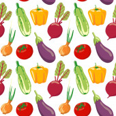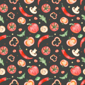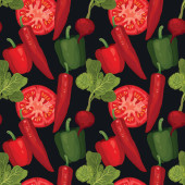 Wzór z warzywami na zielonym tle. Płynny odcisk akwareli. Pomidory, czerwone chili, żółta papryka, pietruszka, oliwki i rozmaryn.