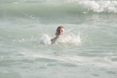 Dwoje dzieci siedzi szczęśliwie w środku fali rozbryzgów nad morzem, na wybrzeżu Morza Północnego w Holandii, Zeeland