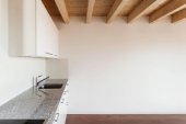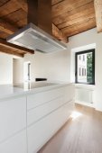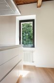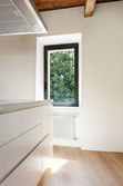 Nowoczesna, biała kuchnia ze stalowym zlewem, małą wyspą i oknem z widokiem na przyrodę. Naturalne światło. Nikogo w środku.