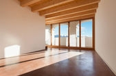Nowoczesny biały kuchnia z wyspy i drzwi z widokiem na przyrodę. Naturalne światło. nie chłopiec wewnątrz