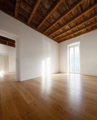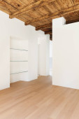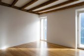 Szczegóły otwartych drzwi, pusty biały pokój z odsłoniętymi belkami drewnianymi i drewnianymi podłogami. Nikogo w środku..