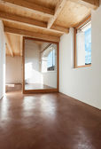 Widok z przodu pusty pokój z dużym oknem na przyrodę i błękitne niebo. Nikogo w środku.