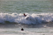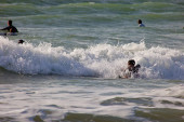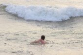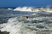 Dwoje dzieci siedzi szczęśliwie w środku fali rozbryzgów nad morzem, na wybrzeżu Morza Północnego w Holandii, Zeeland
