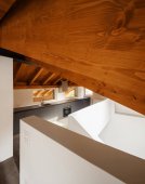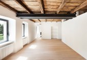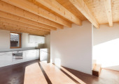 Szczegóły otwartych drzwi, pusty biały pokój z odsłoniętymi belkami drewnianymi i drewnianymi podłogami. Nikogo w środku..