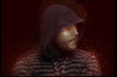Zły, dramatyczny portret mężczyzny w kapturze na czarnym tle. wektor